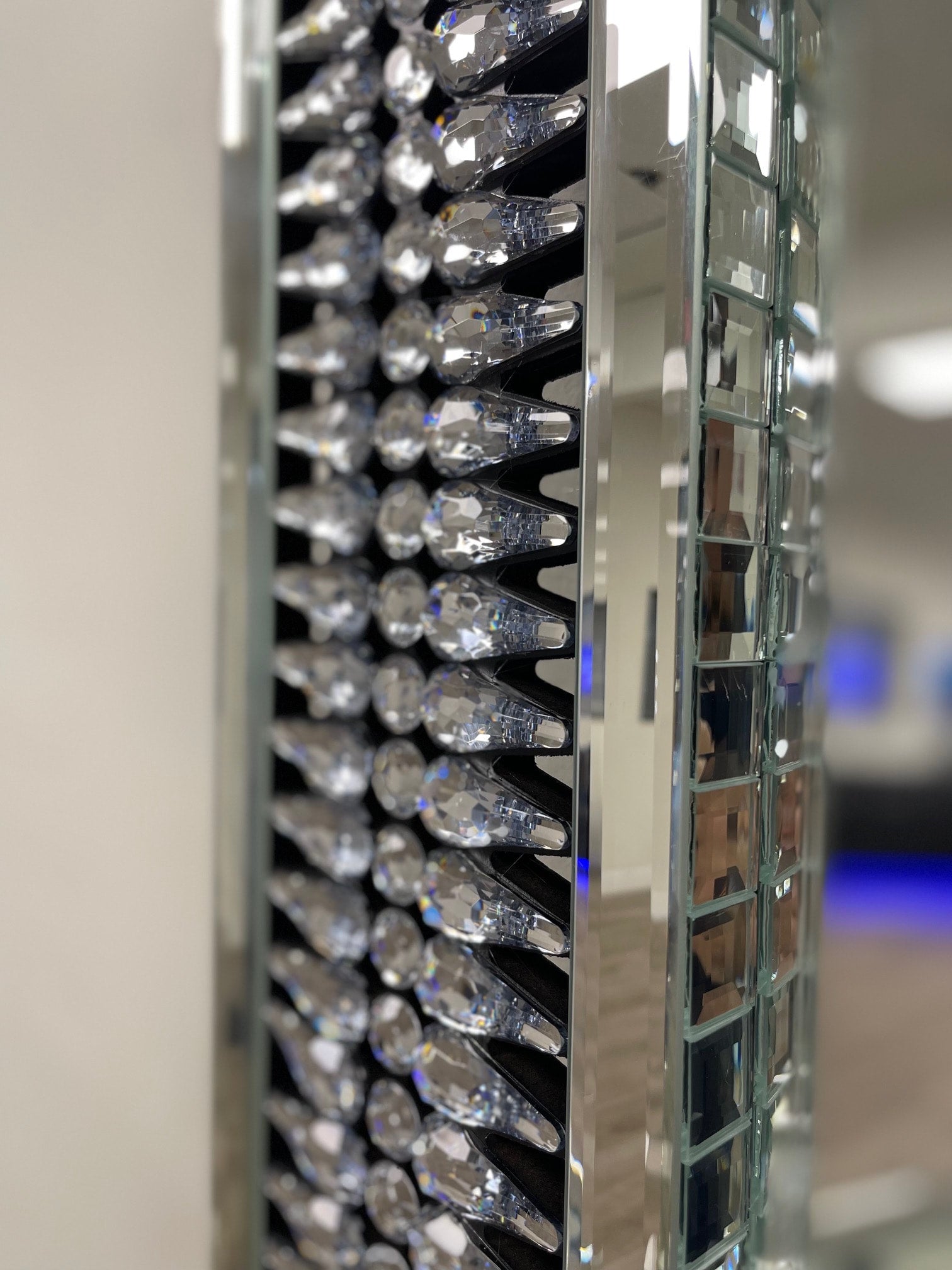 This Floor Mirror features a sophisticated design with glass and crystals, perfect for any glam lover’s home.